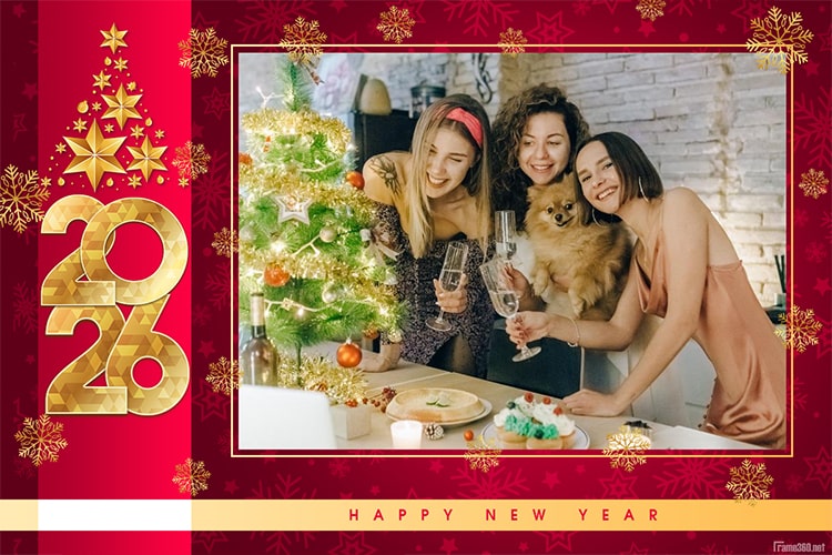 The Happy New Year 2026 photo frame stands out with its elegant red and gold tones, sparkling star and snowflake effects. The large frame design is perfect for personal photos, ideal for New Year party pictures with friends, family, or pets. The warm decorative lights in the background create a vibrant and festive holiday atmosphere.